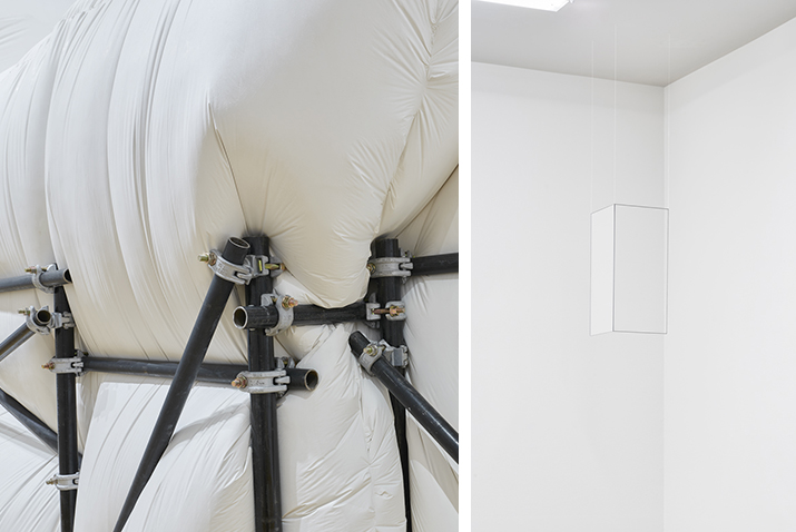 Two contemporary sculptors, Ian McMahon and Jong Oh created different site-specific artworks at deCordova by shaping the intangible element of air. Ian McMahon builds voluminous, pillow-like forms using an innovative technique of sprayed plaster. Jong Oh fashions almost imperceptible structures with string, wire, and Plexiglas. While McMahon emphasizes materiality, solidity, and containment, Oh focuses on transparency, lightness, and expansiveness. Despite the enormous contrasts, the two sculptors’ work is complimentary. Both reshape space by exploring tension, balance, and force. They challenge our perceptions of gravity and perspective by creating forms that expand into the galleries.