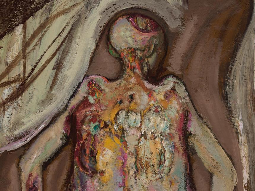 “Hyman Bloom: Matters of Life and Death” includes approximately 70 dramatic paintings and drawings from public and private collections—including the Whitney Museum of American Art, the Museum of Modern Art (MoMA), and the Addison Gallery of American Art—that chart the artist’s career as well as his constant interest in the human body. Bloom’s complex works draw upon the artist’s Jewish faith, his interest in Eastern religions, and his transcendent belief in regeneration. In Female Corpse, Back View (1947), pictured above, he renders a decomposing cadaver with a palette of rich colors. As he remarked, in such images, “the paradox of the harrowing and the beautiful could be brought into unity.”